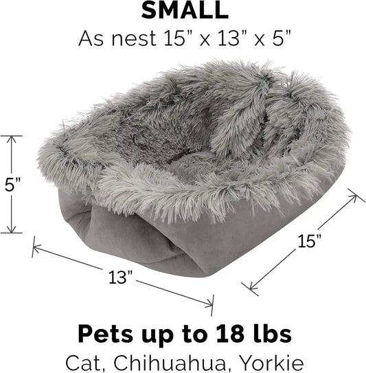 Self-Warming Cat Bed for Indoor Cats, 4-Beds-In-1 & Washable - Plush Long Faux Fur Convertible Cuddler - Gray, Small